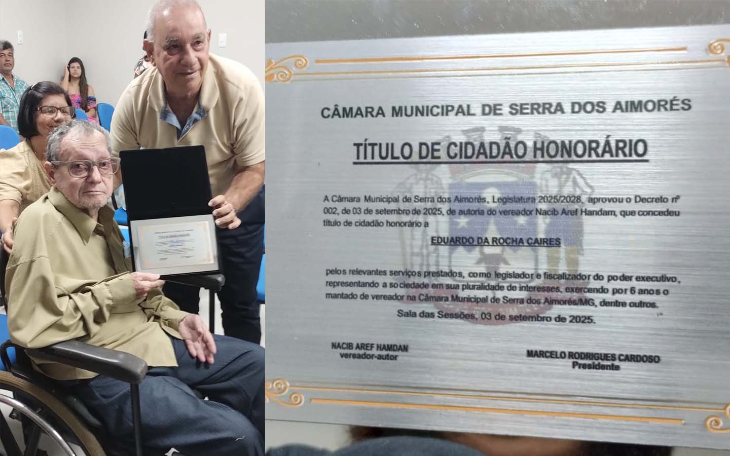 Na noite do dia 15 de dezembro, na Câmara Municipal de Serra dos Aimorés, em reunião solene o Sr. Eduardo da Rocha Caires foi h...